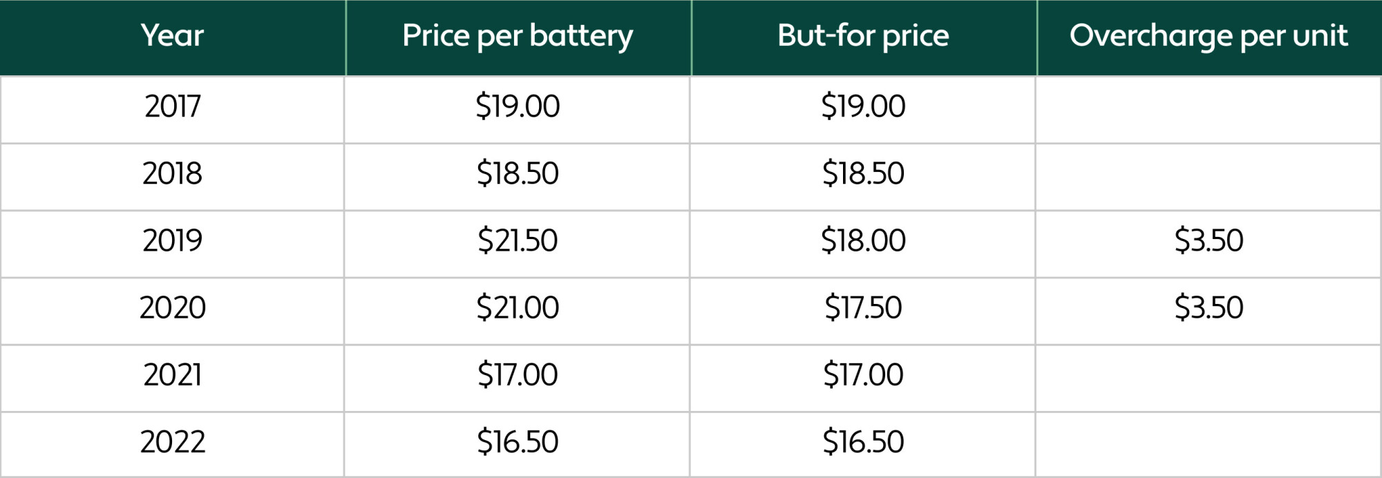 Batteries still may have been price fixed in those years because profits were higher than in other years, but to a lesser extent than what we had previously calculated. Specifically, overpayment per unit was $1.50 instead of $3.50, since the actual price per battery of $3.50 above the but-for price is offset in part by the costs for 2019 and 2020 being $2.00 above the trend.