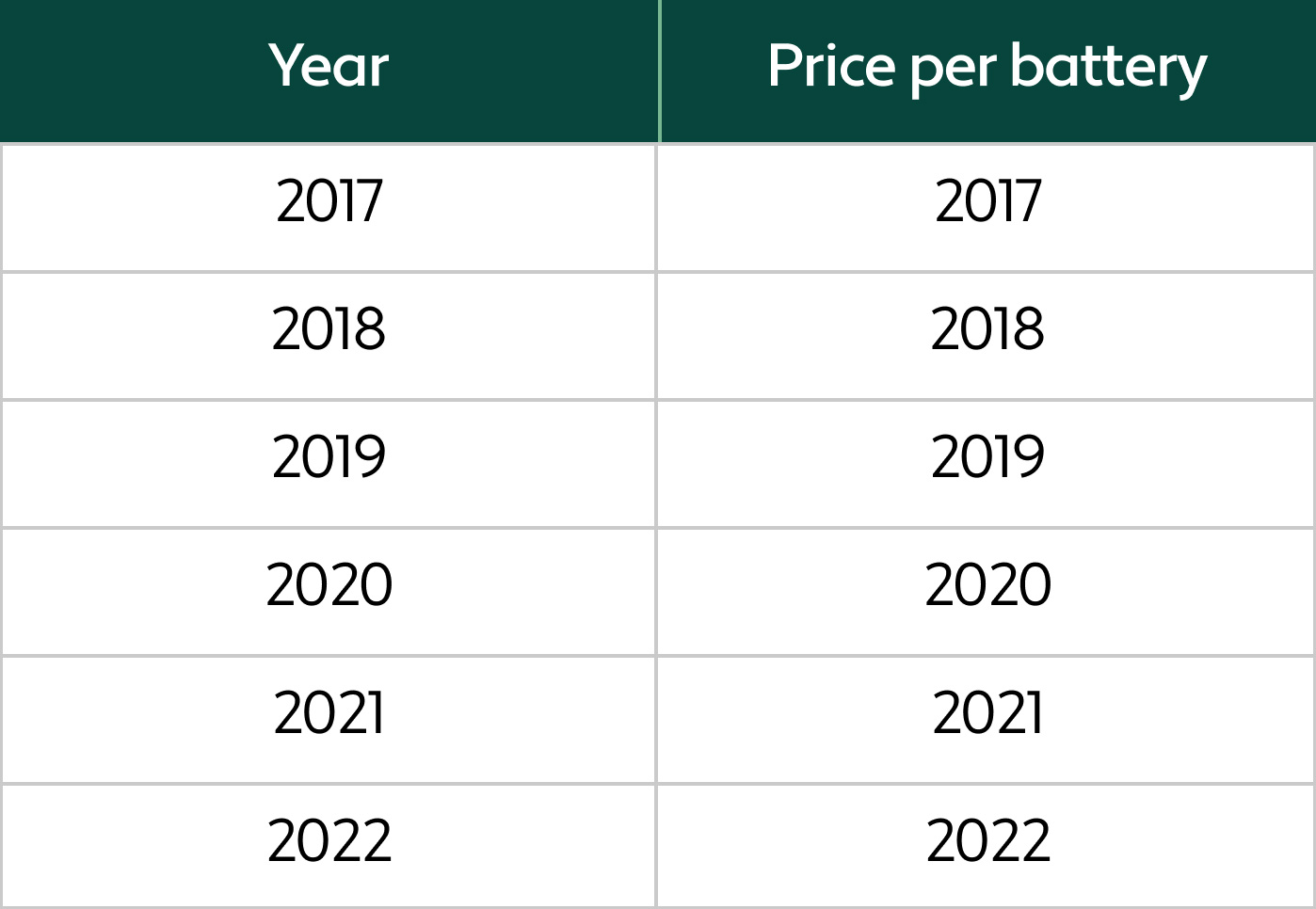 There is a general downward trend in prices, although prices are higher in 2019 and 2020. If you assume that, instead, prices should have continued decreasing at a rate of $0.50 a year, then TalkTek paid $3.50 more per battery than it otherwise would have in 2019 and 2020.